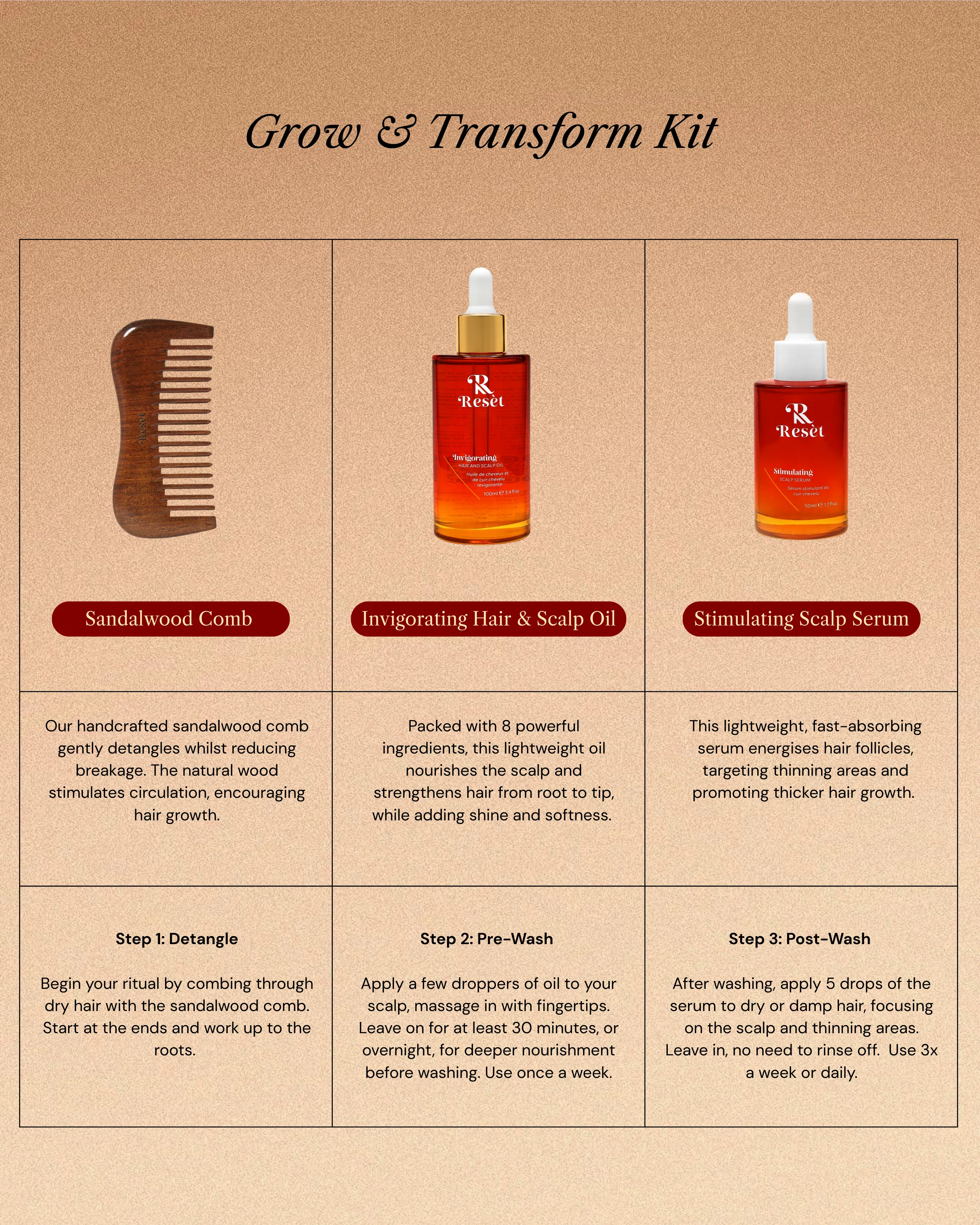 A complete kit with the pre-wash oil and leave-in growth serum to boost hair growth and nourish your hair.
